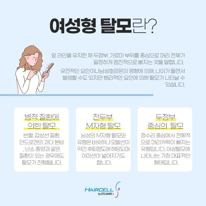 유전적 요인이나 남성 호르몬 영향으로 나이가 들어가며 생길 수도 있고 병리적 요인으로 탈모가 생길 수도 있습니다. 만약 병리적인 요인으로 탈모가 발생하였다면 빈혈, 갑상선 질환, 안드로겐 과다분비, 난소종양과 같은 질환으로 나타날 수 있습니다.