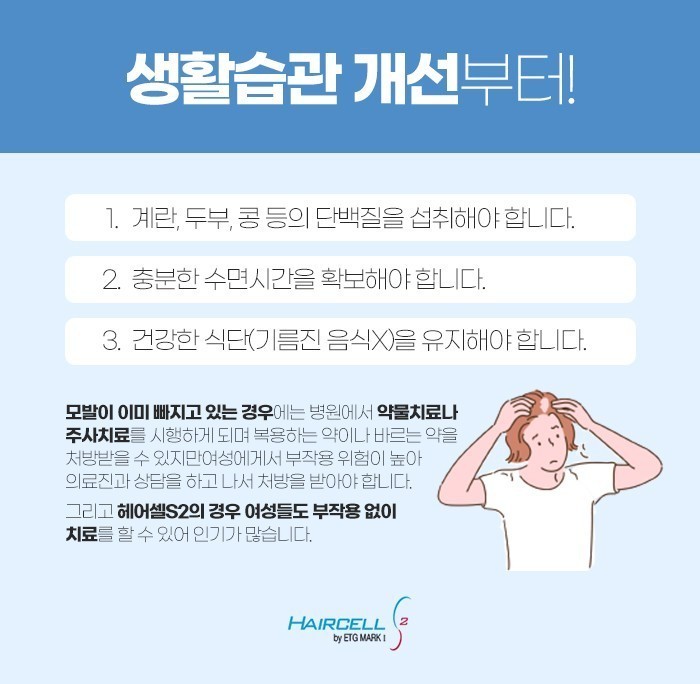 이미 모발이 빠지고 있을 땐 약물 치료나 주사 치료를 통해서 관리할 수도 있는데요. 하지만 여성의 경우 이상 증상이 발생하는 위험도 높아질 수 있어 의료진과 상담을 받아보셔야 한답니다. 이럴 때 추천드려볼 수도 있는 것이 헤어셀S2이기도 한데요. 이유는 여성 환자분들도 이상 증상을 덜면서 동두천 탈모관리 치료에 대한 도움을 받아볼 수 있기 때문이기도 합니다.